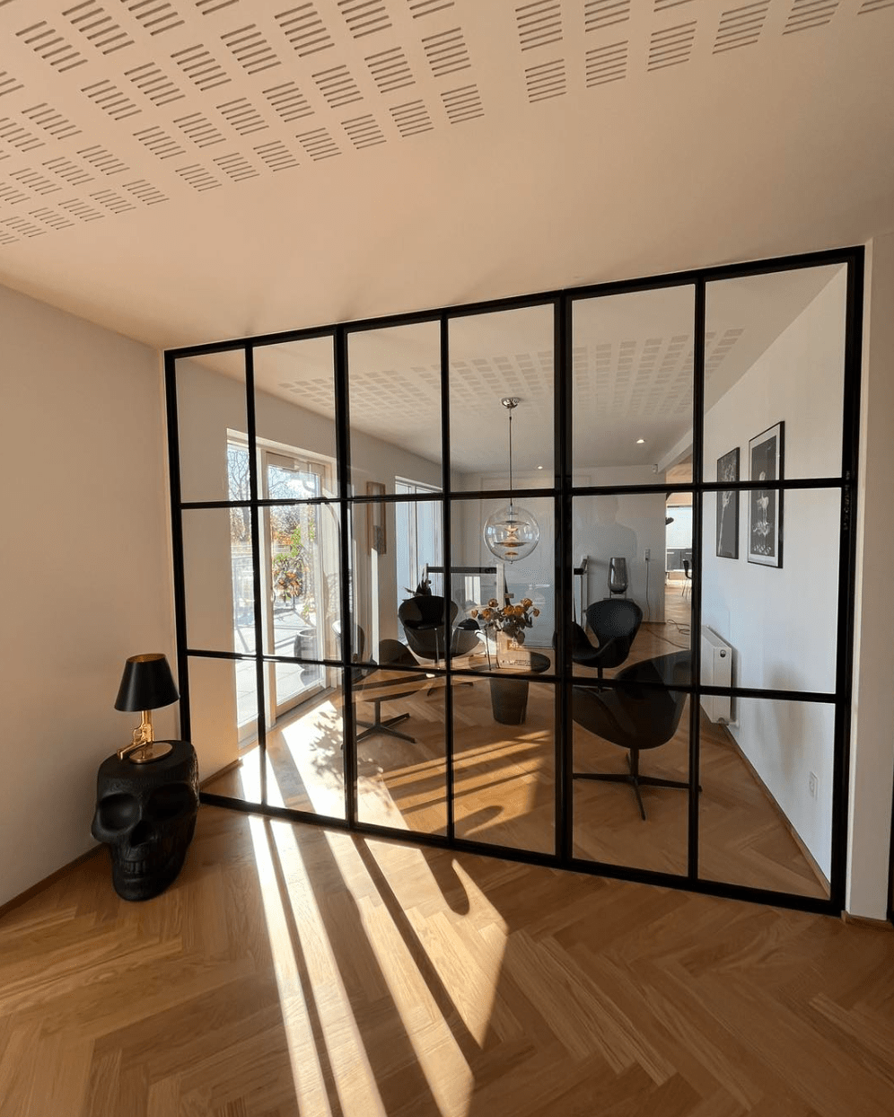 Det er en indvendig skillevæg i stål og glas med integreret dør, som opdeler rum uden at fjerne lys og udsyn.